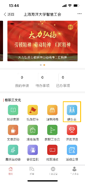 1. 通过手机端进入“i海洋”程序,搜索“智慧工会”平台,点击“健步走”模块进行报名。